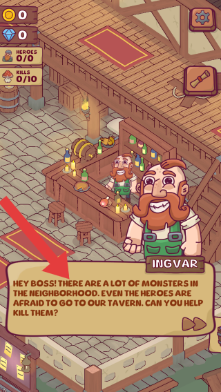 2、角色I(xiàn)NGVAR向玩家(BOSS)反饋:附近有很多怪物,連英雄都不敢來(lái)酒館,請(qǐng)求幫忙消滅怪物,呈現(xiàn)游戲初期任務(wù)引導(dǎo)場(chǎng)景。