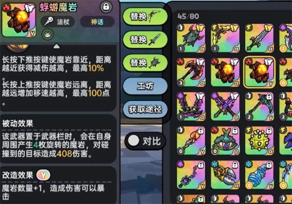 多面手特性:適用于不同戰(zhàn)斗場景,長按下推按鍵魔巖靠近獲得減傷,長按上推按鍵魔巖遠(yuǎn)離提升移速,被動生成4枚旋轉(zhuǎn)魔巖持續(xù)輸出