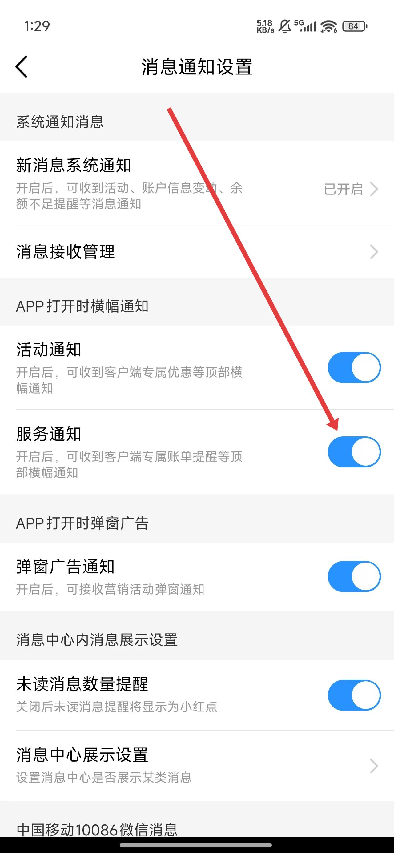 4、進入到消息通知設置頁面后,若想取消服務通知功能,可以點擊開關按鈕,關閉該功能。