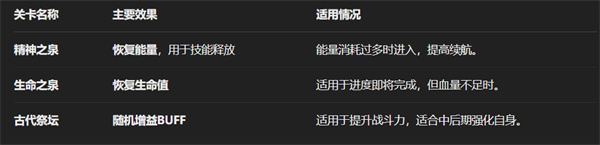 2、增益關(guān)卡中,精神之泉優(yōu)先于能量不足或依賴(lài)大招流派;生命之泉在BOSS戰(zhàn)前或殘血時(shí)必選;古代祭壇適合追求爆發(fā)輸出或特殊機(jī)制強(qiáng)化,BUFF選擇需結(jié)合當(dāng)前戰(zhàn)斗需求。