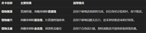 怪物集落:小怪?jǐn)?shù)量多但強(qiáng)度低,提供基礎(chǔ)金幣、經(jīng)驗(yàn)與材料,額外掉落20%幾率為當(dāng)前層數(shù)對(duì)應(yīng)裝備,適合低層數(shù)穩(wěn)步發(fā)育或殘血狀態(tài)恢復(fù)。