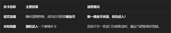 3、特殊關(guān)卡中,詛咒寶箱是獲取暗金幣的唯一途徑,無(wú)論難度均應(yīng)優(yōu)先嘗試;未知地圖在其他選項(xiàng)收益有限時(shí)作為備選,可能提供驚喜資源或隱藏挑戰(zhàn)。