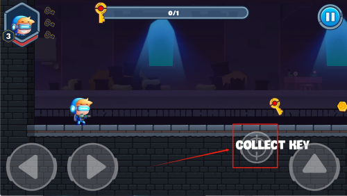 1、在初始場景中操控角色向左移動,注意收集紅框標(biāo)記的黃色鑰匙,屏幕上方顯示"0/1"提示還需獲取鑰匙,避開障礙物確保安全。