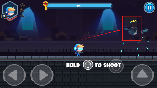 2、遇到敵人時按住底部"HOLD TO SHOOT"按鈕瞄準(zhǔn),將準(zhǔn)星對準(zhǔn)紅框內(nèi)目標(biāo)后松開射擊,成功擊敗可獲得"+40"分?jǐn)?shù)獎勵。