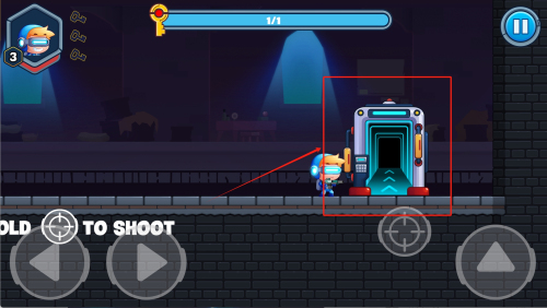 3、接近關(guān)卡末尾時尋找紅框標(biāo)注的藍(lán)色裝置,按照"OLD TO SHOOT"提示進(jìn)行特殊互動,觸發(fā)機(jī)關(guān)開啟通關(guān)路徑完成關(guān)卡。