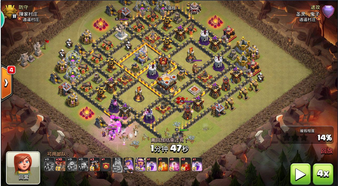 格子陣應(yīng)對(duì)策略:格子陣弱點(diǎn)在于防御間隔較大,建議采用"分段推進(jìn)":先用女巫清理外圍,再用狗球突破核心,例如,在攻擊"九宮格"陣型時(shí),先清理四角防御。