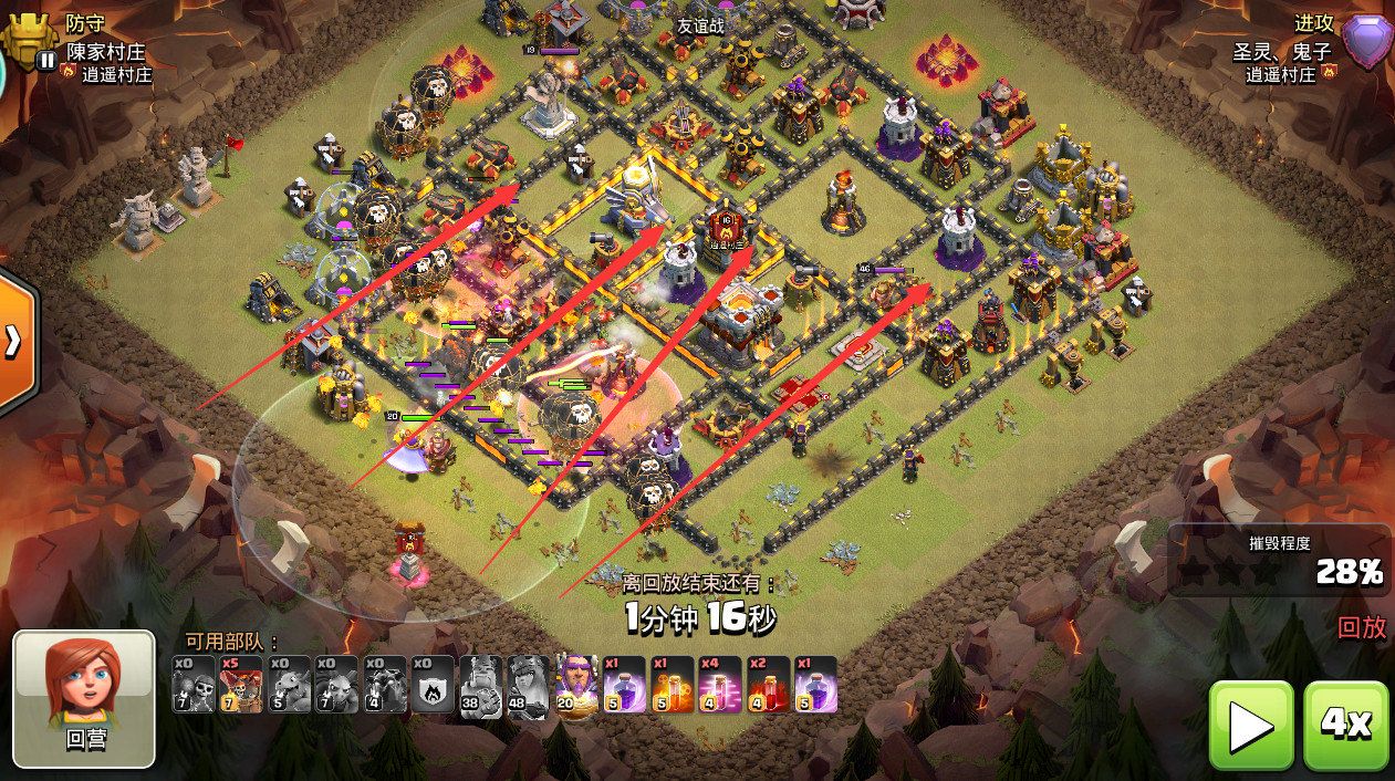 陷阱應(yīng)對(duì)策略:建議使用"偵查法術(shù)"標(biāo)記敵方陷阱,重點(diǎn)關(guān)注"巨型炸彈"(通常布置在城墻內(nèi)2格)、"彈簧陷阱"(通常布置在通道狹窄處)、"空中炸彈"。