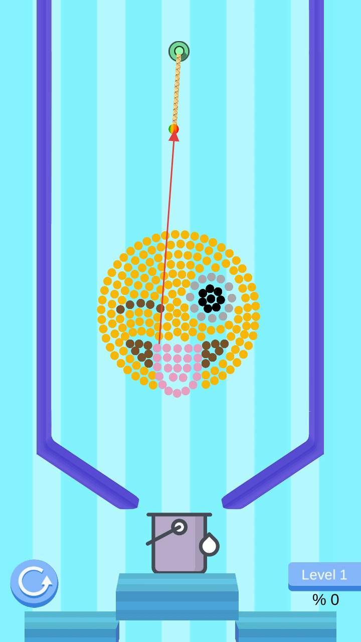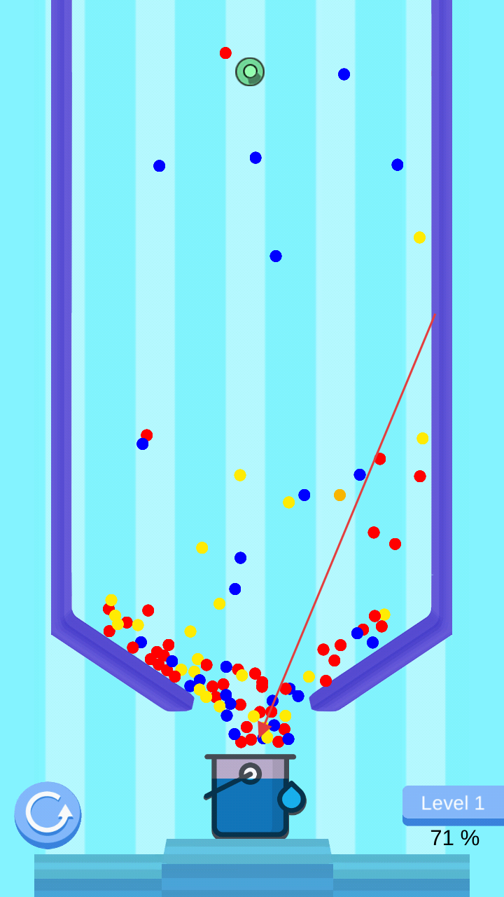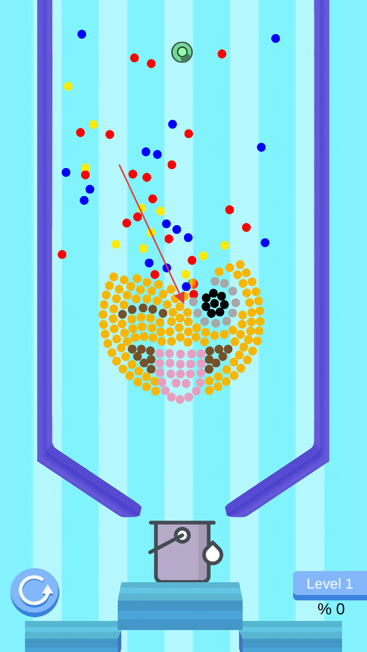 2、點擊屏幕釋放頂部小球,讓其墜落并碰撞、消除同色小球,填充下方容器。
