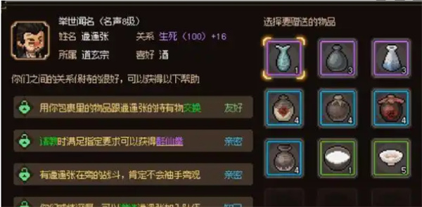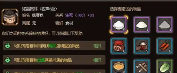 1、選對應NPC喜好物品(如唐春秋喜食材、通通張好酒)贈送,提升“生死”關系等級,解鎖合作/交易權限。