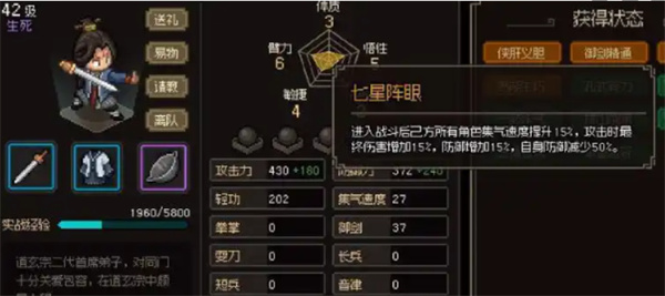 2、進入角色界面,查看NPC體質(zhì)、攻防等屬性,了解戰(zhàn)力與特質(zhì)(如“七星陣眼”被動)。