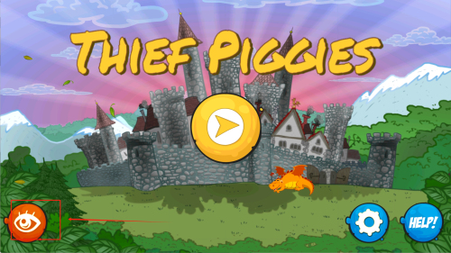 1、在游戲主界面點擊黃色圓形"THIEF PIGGIES"開始按鈕進入游戲,注意左下角眼睛圖標可切換觀察模式,右下角設置圖標調整游戲參數(shù)。