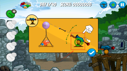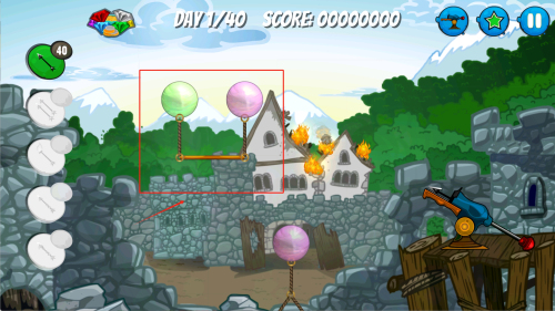 2、進入DAY1關卡后,操作投石機瞄準紅框選中的綠色氣球,調整發(fā)射角度和力度,點擊右側發(fā)射按鈕將道具投射出去。