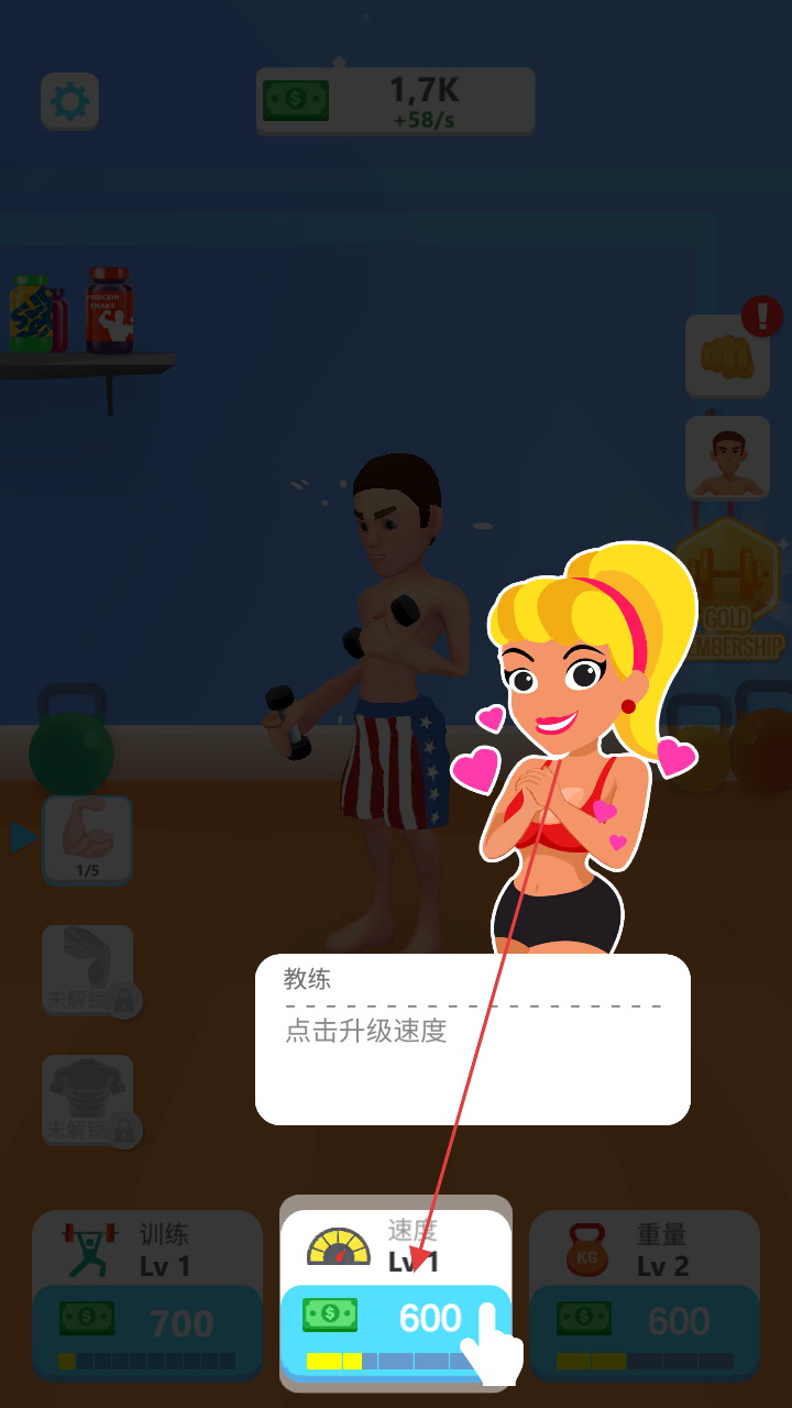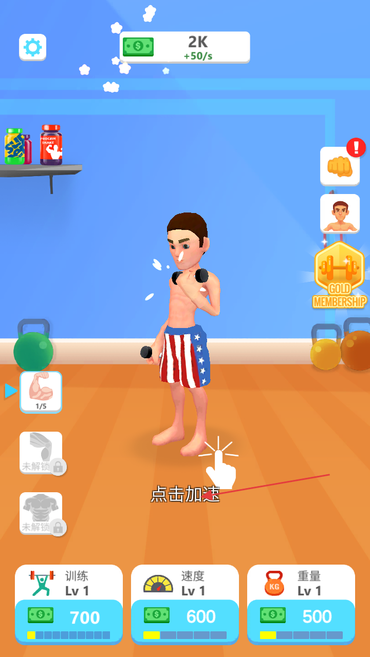 1、進(jìn)入游戲界面,點擊“點擊加速”按鈕,加快健身訓(xùn)練進(jìn)程,提升角色屬性。