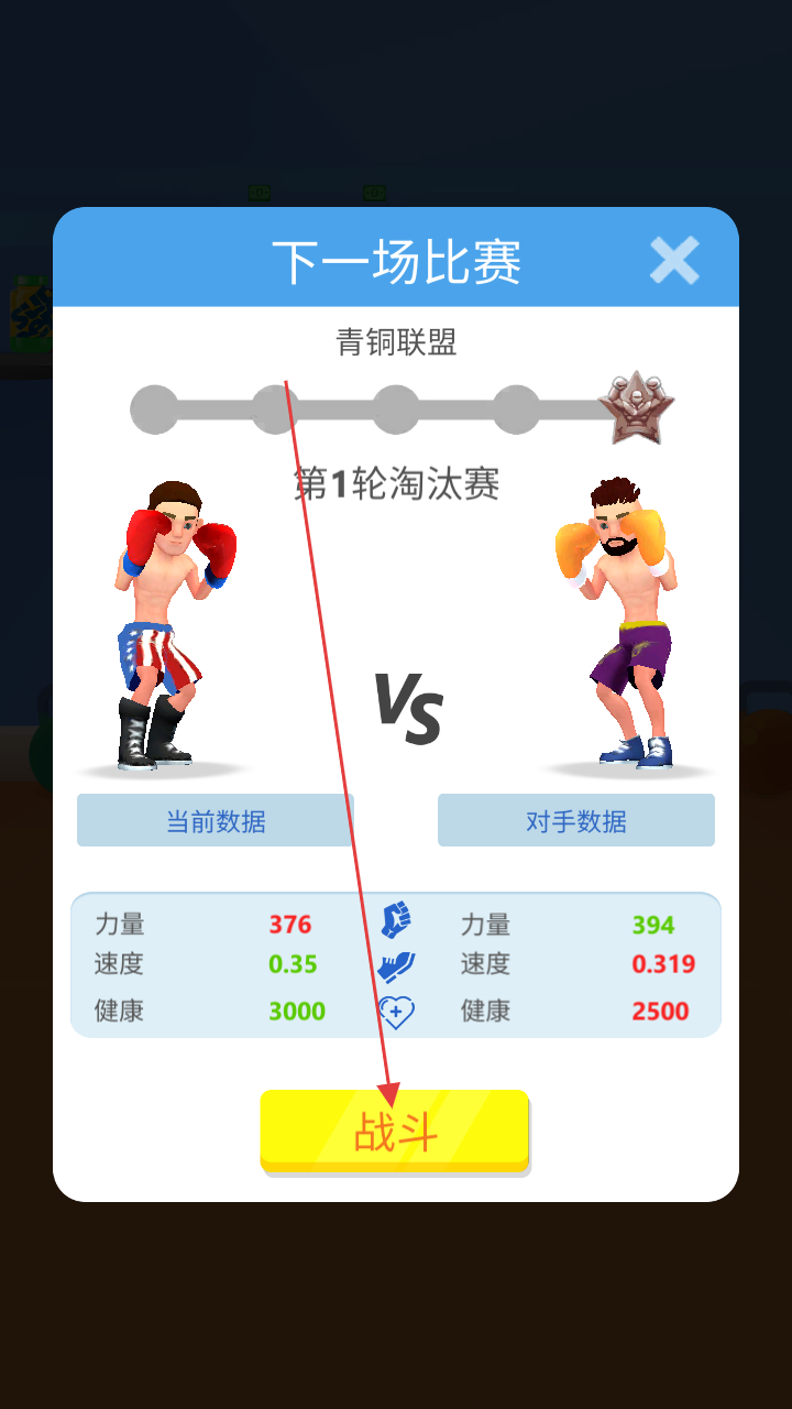 3、在比賽界面,查看雙方數(shù)據(jù),點擊“戰(zhàn)斗”按鈕,讓訓(xùn)練后的角色參與拳擊對決。