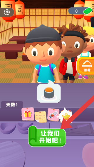1、呈現(xiàn)壽司店場(chǎng)景,有卡通風(fēng)格的顧客角色,界面有禮物、便簽等圖標(biāo),屬于模擬經(jīng)營類畫面,玩家扮演壽司店經(jīng)營者,需按顧客需求制作、提供壽司。