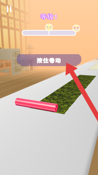 2、呈現(xiàn)的是壽司制作流程里卷制海苔等食材的環(huán)節(jié),玩家需通過按住操作完成壽司卷制作步驟,屬于美食模擬經(jīng)營或休閑操作類內(nèi)容。