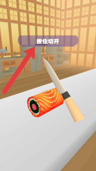 3、有“按住切開”的操作提示,以及壽司、刀具等制作壽司的元素,呈現(xiàn)的是壽司制作流程中切割壽司卷的環(huán)節(jié),玩家需通過按住操作完成切割步驟,體驗(yàn)?zāi)M制作壽司的樂趣。