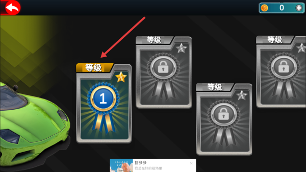 2、選“等級(jí)1”(藍(lán)徽章),解鎖基礎(chǔ)關(guān)卡,開(kāi)始賽車(chē)挑戰(zhàn)。