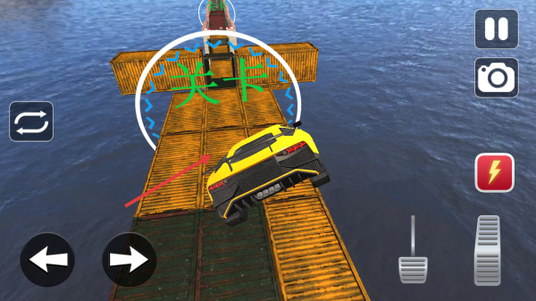 3、駕駛時(shí)控方向(左右鍵)、油門(mén),過(guò)水上木板橋,避落水,完成關(guān)卡,賺金幣解鎖新車(chē)。
