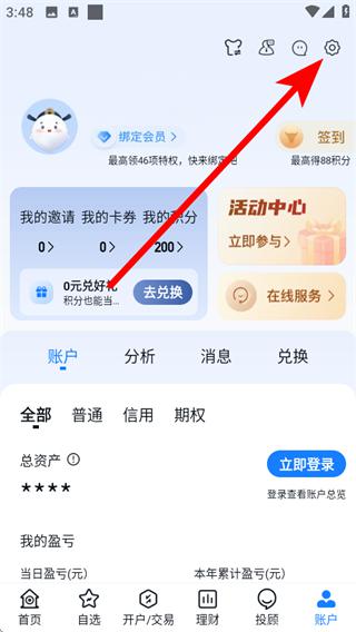 1、在東吳秀財賬戶頁面,點擊右上角設(shè)置圖標(biāo),進入設(shè)置界面。