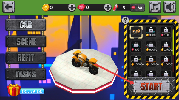2、在車輛界面,確認(rèn)所選賽車,點(diǎn)擊【START】,進(jìn)入關(guān)卡,開始山地賽道的駕駛冒險(xiǎn)。