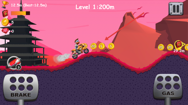 3、關(guān)卡中,操控“BRAKE”(剎車)和“GAS”(油門),跨越地形,收集金幣(箭頭指向),推進(jìn)Level1,刷新最佳成績(jī)。