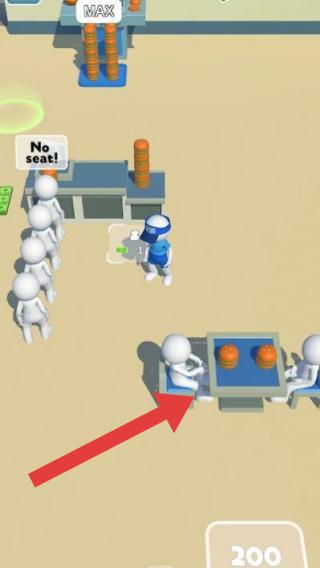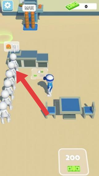 2、玩家扮演店主,需引導(dǎo)排隊(duì)顧客(圖中白色小人隊(duì)列)就座、服務(wù),通過經(jīng)營(yíng)餐廳(如制作售賣餐品)獲取收益,體驗(yàn)餐廳運(yùn)營(yíng)的策略與樂趣。