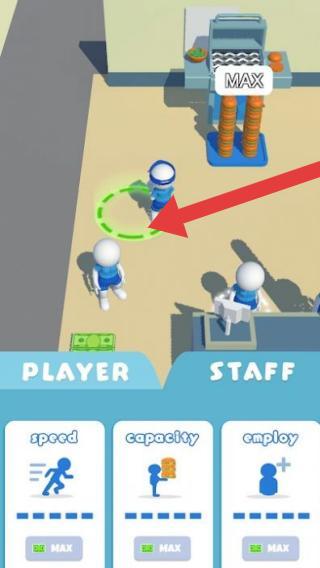 3、玩家可操控角色(“PLAYER”),還能管理員工(“STAFF”),通過升級(jí)速度(“speed”)、容量(“capacity”)等屬性,調(diào)配員工服務(wù)顧客、制作餐品,經(jīng)營(yíng)餐廳獲取收益。