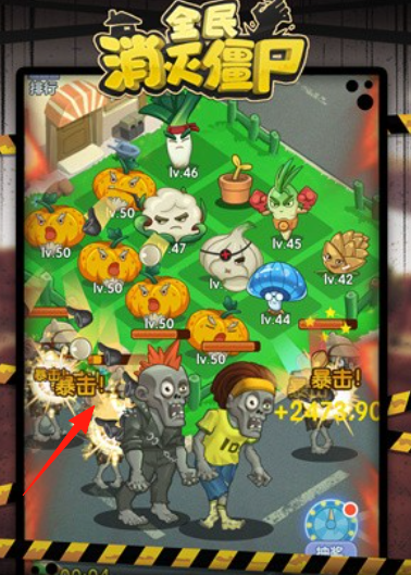 2、戰(zhàn)斗攻擊植物自動攻擊,觸發(fā)“暴擊”傷害,清理多波僵尸,保護(hù)后方建筑。