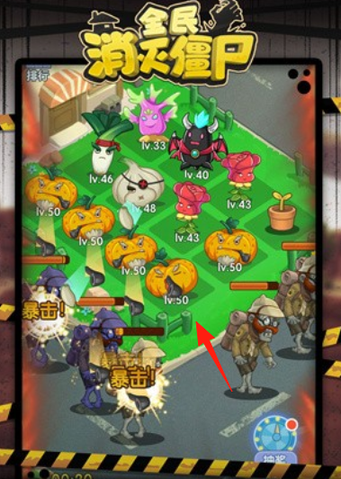1、植物布陣布置南瓜(lv.50)、蘿卜(lv.46)等植物,組成防御陣,攻擊僵尸(搖滾、運(yùn)動僵尸)。