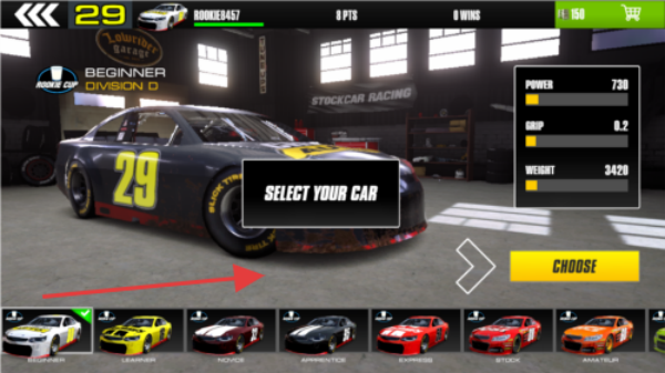 1、進(jìn)入車庫,瀏覽賽車列表,選定心儀賽車后,點(diǎn)擊右側(cè)黃色【CHOOSE】按鈕,確認(rèn)賽車開始賽事。