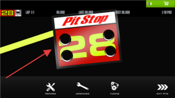 2、在【Pit Stop】界面,可對賽車進(jìn)行【REPAIRS】維修、【UPGRADES】升級等操作,優(yōu)化賽車性能。