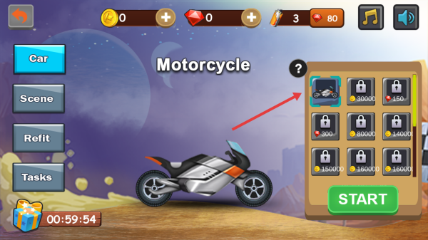 1、主界面點(diǎn)擊【PLAY】,進(jìn)入車輛選擇頁,選已解鎖摩托,點(diǎn)【START】開啟登山競速。