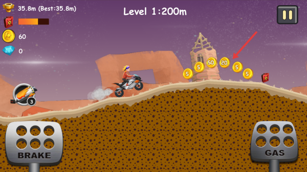 3、優(yōu)先收集大金幣(如20面值),利用地形跳躍,積累金幣升級車輛,挑戰(zhàn)更遠(yuǎn)距離。
