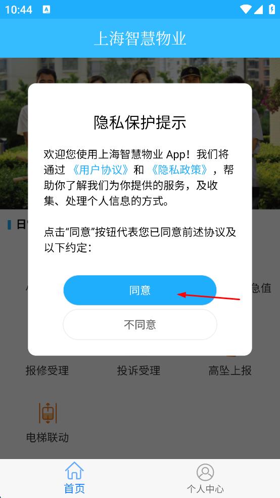 1、打開(kāi)上海智慧物業(yè)App,在彈出的隱私保護(hù)提示彈窗中,點(diǎn)擊同意按鈕,進(jìn)入首頁(yè)。