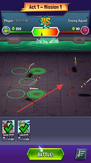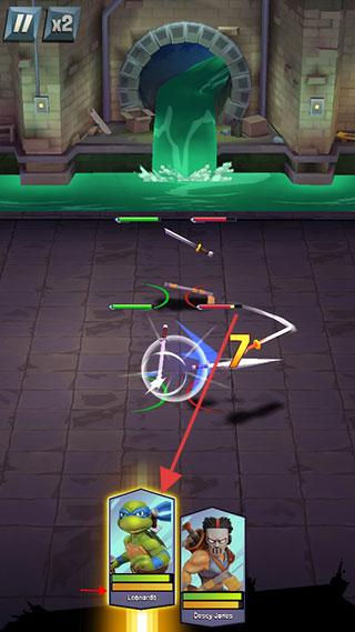 3、戰(zhàn)斗中,點(diǎn)擊箭頭指向的忍者神龜卡牌(如萊昂納多),釋放技能,攻擊敵人,配合隊(duì)友,贏取勝利。