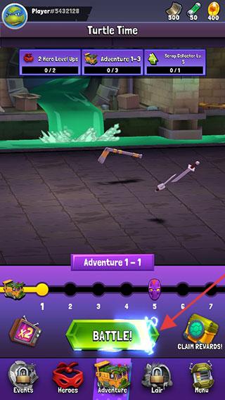 1、在“Turtle Time”界面,點(diǎn)擊【BATTLE!】,進(jìn)入“Adventure1-1”關(guān)卡,準(zhǔn)備用忍者神龜戰(zhàn)斗,推進(jìn)冒險(xiǎn)。