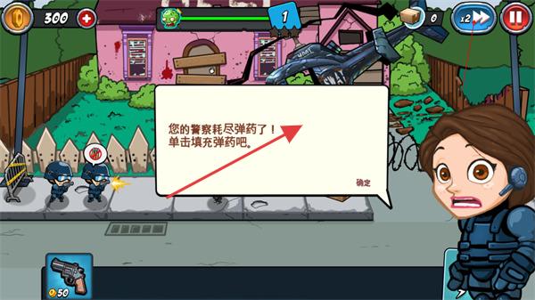 3、遇提示“警察耗盡彈藥”,點(diǎn)擊填充,補(bǔ)充子彈,持續(xù)射擊僵尸,守護(hù)房屋,完成關(guān)卡,獲取獎(jiǎng)勵(lì)。