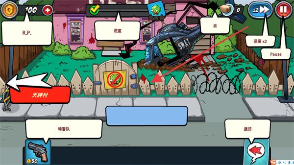 2、戰(zhàn)斗界面,按箭頭指引,選“進(jìn)度”等功能,派特警隊(duì)(如“天神村”隊(duì)伍),利用直升機(jī)、圍欄,阻擋僵尸。