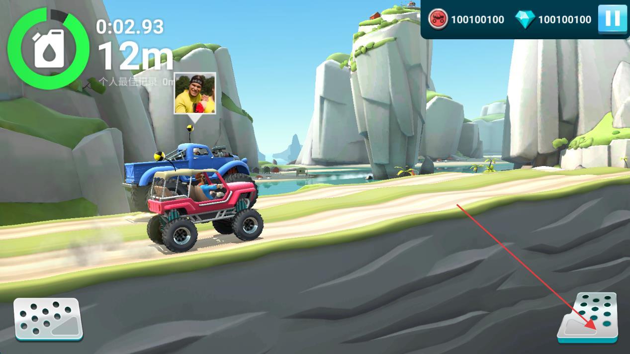 1、選擇初始越野車駛?cè)胧讞l叢林賽道,通過左屏剎車鍵控制下坡速度,右屏油門鍵維持爬坡動力,保持車身平衡向前行進。