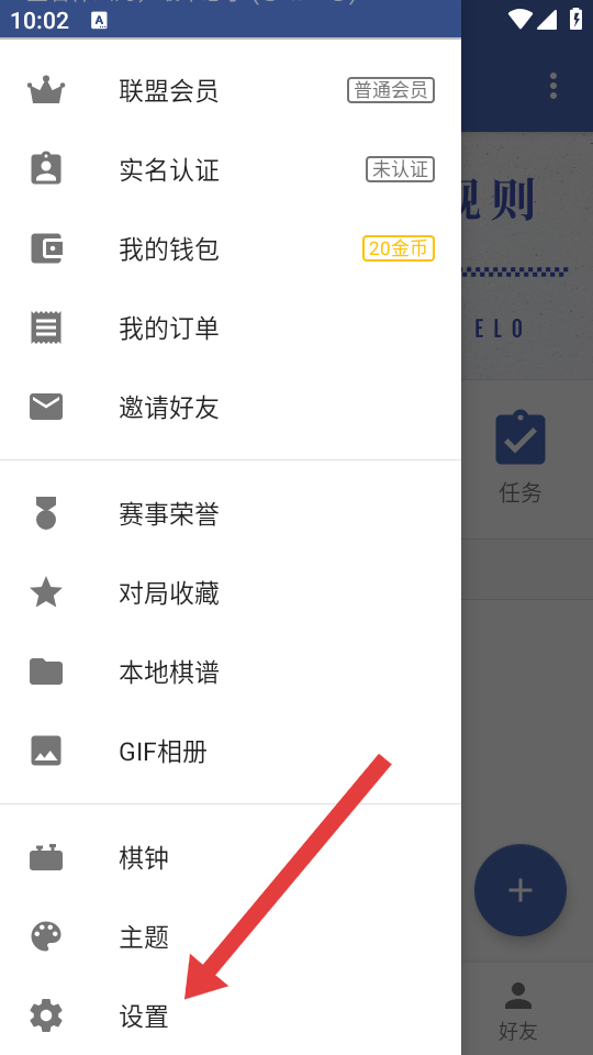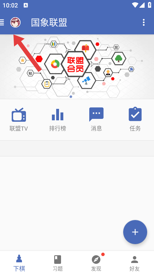 1、在國象聯(lián)盟下棋頁面,點擊左上角的頭像,展開側(cè)邊功能欄。