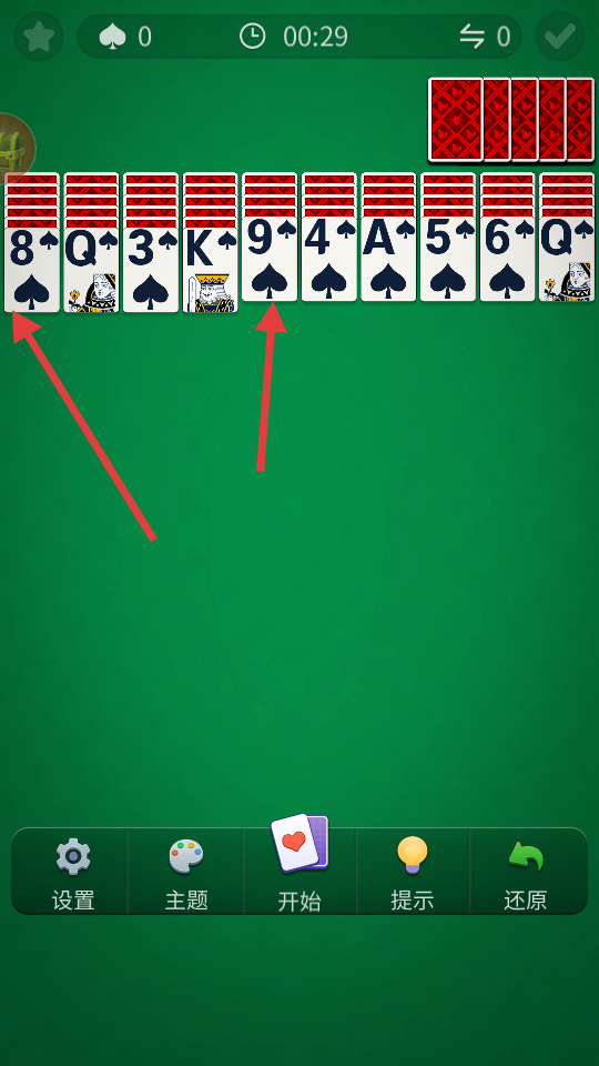 2、每次只能移動(dòng)連續(xù)的同花色牌列,想耍小聰明混搭移動(dòng)?系統(tǒng)會(huì)無(wú)情拒絕。