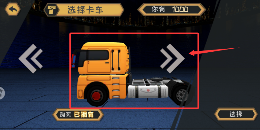 2、進入卡車選擇界面,滑動切換心儀的卡車,確認點擊選擇開啟運輸挑戰(zhàn)。