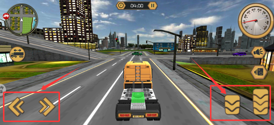 3、駕駛時可用左側按鍵控方向,右側按鍵調(diào)車速,在城市道路按地圖完成運輸。