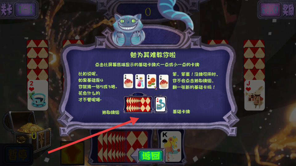 3、反轉(zhuǎn)仙境:特別關(guān)卡需要倒著排列卡牌,數(shù)字小的壓住數(shù)字大的,紅心皇后會全程用鏡像字幕給你提示。