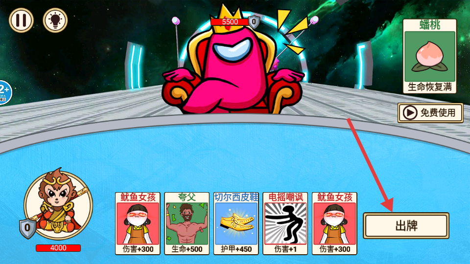 3、當(dāng)二郎神和太空人開始互相扔卡牌時(shí),記得躲開那些亂飛的技能特效。