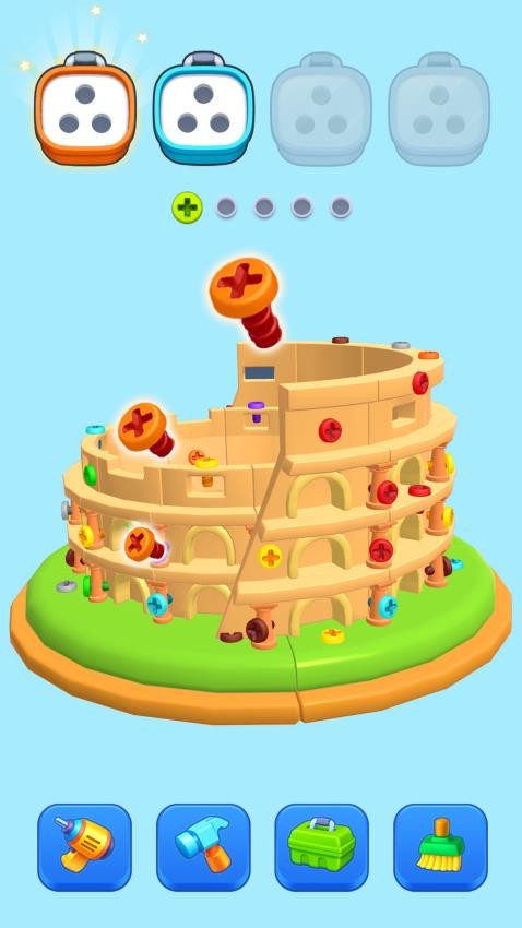 1、核心玩法圍繞觀察-拆除-消除展開(kāi),需要先分析建筑結(jié)構(gòu),規(guī)劃拆除順序,兼顧螺絲的顏色分類(lèi),實(shí)現(xiàn)高效操作。