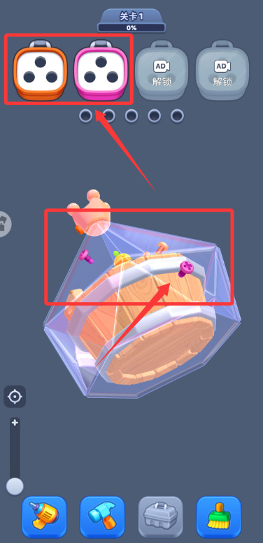 2、將拆下的螺絲按顏色分類(lèi)放入對(duì)應(yīng)收納盒,集齊三個(gè)同色螺絲即可觸發(fā)消除效果。