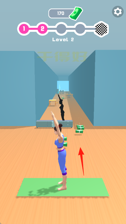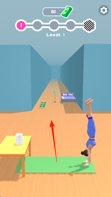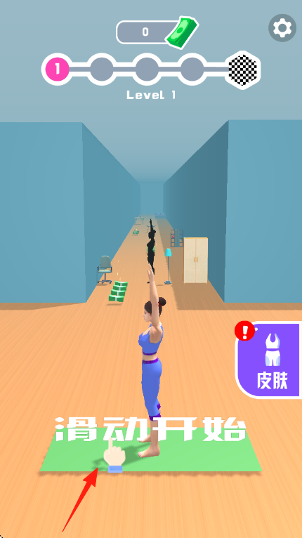 1、操作流程“滑動開始”,控制瑜伽角色,在“Level1”室內(nèi)場景,用瑜伽動作(站立、倒立)前進,收集綠色鈔票。