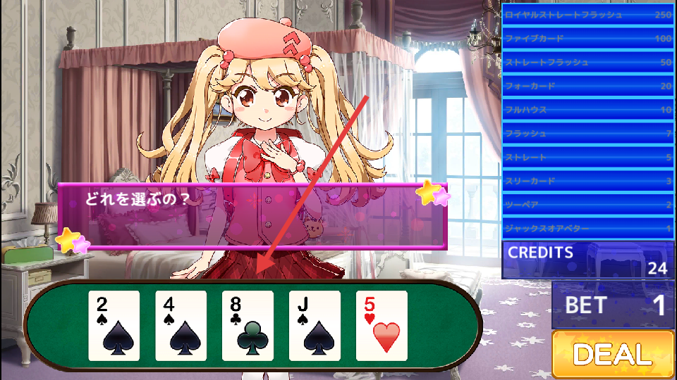 1、基礎(chǔ)牌局:系統(tǒng)自動發(fā)五張牌,點(diǎn)擊保留想留的牌,換牌后與妹妹比大小定勝負(fù)。贏牌時會累積好感度計(jì)量表,集滿后下一局必定出現(xiàn)互動動畫。